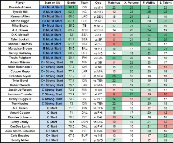 The players are sorted by grade in descending order with the highest grades at the top and the lowest at the bottom. The highest-graded players receive A+ (Must start), and the lowest receive F. However, there are varying degrees of the F grade, and some players with this grade are flex plays, desperation plays, Hail Mary plays, or should remain on your bench, depending on the grade and position.