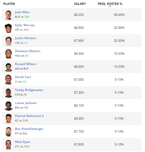 Next up, we’ve got two quarterbacks in the 20-30% range: Kyler Murray and Justin Herbert. Murray has a winnable matchup against the Dolphins, but their defense ranks eighth-best against the position. He’s still a high-end QB1, but I don’t know if he’s worth his salary here. Herbert is a bit more of a bargain at his price point, and he should put up lots of points against the Raiders.