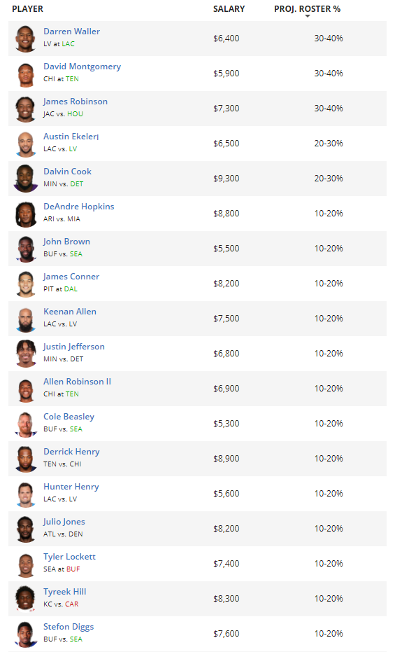 There are a handful of plays worth noting in the 10-20% range. Julio Jones‘ rostership should skyrocket if Calvin Ridley is held out of Sunday’s game, and Tyler Lockett should be on a higher percentage of rosters since D.K. Metcalf will have to face Tre’Davious White. John Brown and Cole Beasley make smart bargain-bin picks against Seattle’s putrid defense.
