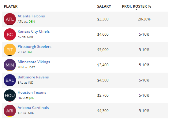 Elsewhere, Pittsburgh should make a fantastic (albeit expensive) option against the Cowboys. The Steelers average a league-best 4.3 sacks per game, so they will score a ton of points here; the only question is whether you can fit them into your lineup at their current price point. It’s worth noting that a few key defensive playmakers for Baltimore and Houston could miss Sunday’s game due to the coronavirus, so you should keep a close eye on their lineups before you commit to either of them.