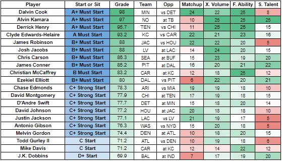 After a supremely dominant Week 8 showing, Dalvin Cook earns our highest grade for the second week in a row. Coming in just behind him are Alvin Kamara, Derrick Henry, CEH, and James Robinson. James Conner also gets a great matchup with Dallas.