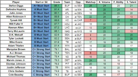 The players are sorted by grade in descending order with the highest grades at the top and the lowest at the bottom. The highest-graded players receive A+ (Must start), and the lowest receive F. However, there are varying degrees of the F grade, and some players with this grade are flex plays, desperation plays, Hail Mary plays, or should remain on your bench, depending on the grade and position.
