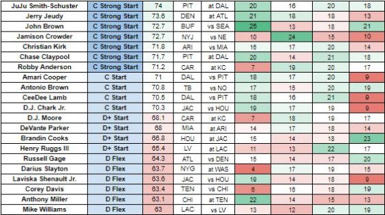 Not too many surprises here. Travis Kelce will remain the TE1 every week he’s on the field. The rest of the top-5 consist of studs with strong matchups, Jonnu Smith falls out of the top-5, and Mark Andrews is our ninth-highest graded TE as he faces the league’s stingiest defense to the position.