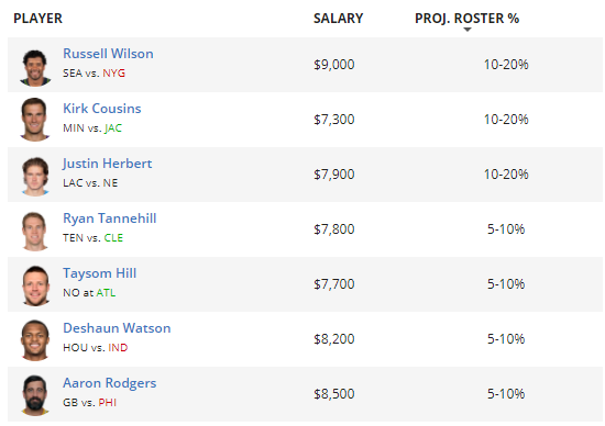 There isn’t much consensus at quarterback on FanDuel this week, and our most popular options are three guys in the 10-20% range: Russell Wilson, Kirk Cousins, and Justin Herbert.