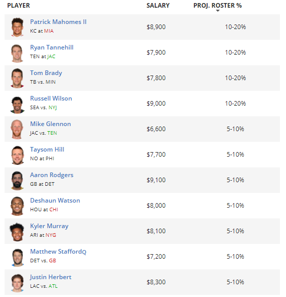 We don’t have much clear chalk this week. At quarterback, four players top the charts in the 10-20% range: Patrick Mahomes, Ryan Tannehill, Russell Wilson, and Tom Brady.