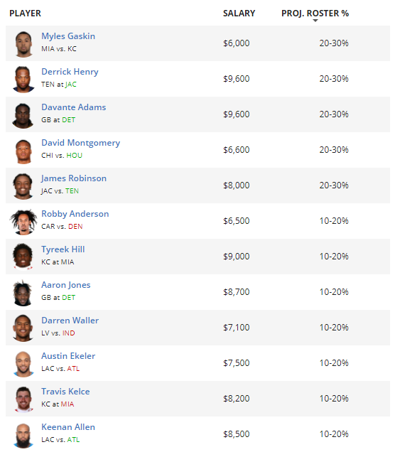 Each week, I’ll break down the projected player roster percentages at the top DFS sites. These figures are generated based on numbers pulled from full-slate contests, so they won’t be perfectly accurate, but they give us a good measurement of who’s popular.