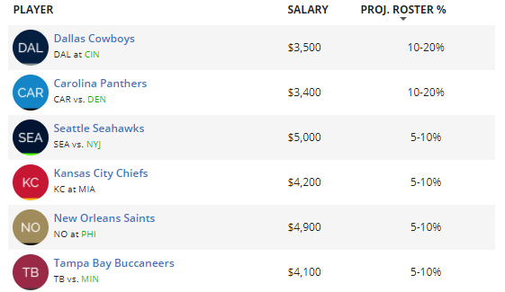 The Dallas Cowboys should be one of the most popular options this week, and honestly, I think they’re a great target. The Bengals are terrible, and their offensive line has given up the second-most sacks in the league. They fare better in terms of adjusted sack rate (which compensates for quarterback error), but that doesn’t mean much when you have Brandon Allen under center. They’re a great bargain-bin play if you need one.