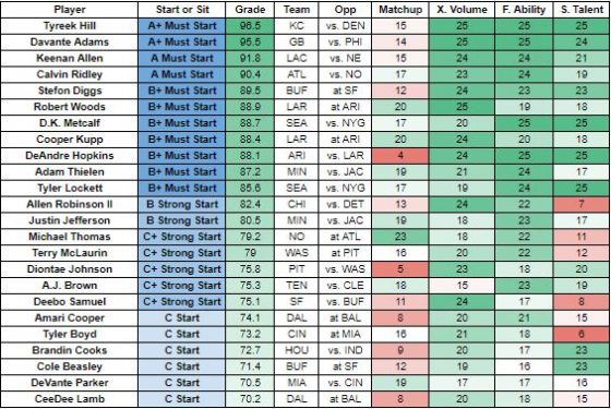 A 200-yard first quarter will cause a guy to get pretty high marks. In this week’s Quick Grades, it causes that guy to get the best marks. Tyreek Hill grades out over every other wideout this week, with target hogs Davante Adams and Keenan Allen just behind him. Calvin Ridley is in for a big workload if Julio Jones is out, and both Robert Woods and Cooper Kupp could provide big performances for fantasy managers in an important divisional showdown with Arizona.