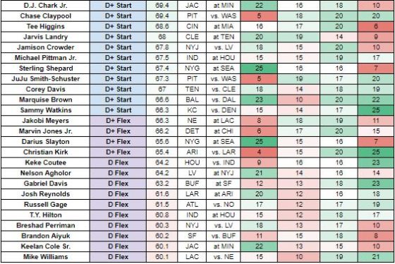 The players are sorted by grade in descending order with the highest grades at the top and the lowest at the bottom. The highest-graded players receive A+ (Must start), and the lowest receive F. However, there are varying degrees of the F grade, and some players with this grade are flex plays, desperation plays, Hail Mary plays, or should remain on your bench, depending on the grade and position.