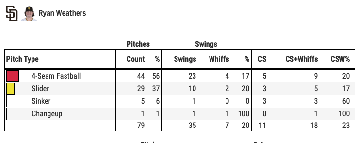 Weathers primarily uses two pitches in his four-seamer and slider while also sprinkles in a changeup and sinker. On Friday, that remained the case as he used those two pitches 95% of the time. However, in that game, Weathers only elicited a 20% whiff rate and 23% called strike plus whiff rate (CSW%) overall, which indicated he wasn’t too sharp against the Dodgers.