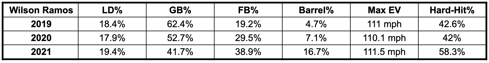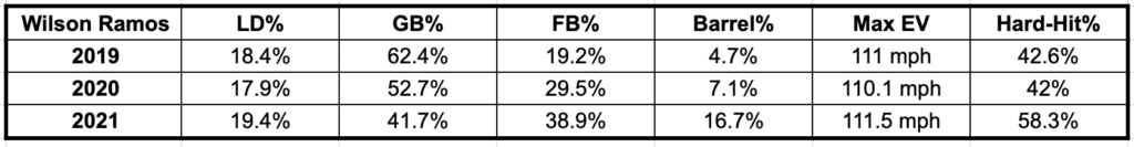 One main difference for Wilson Ramos involves the ground ball and fly ball rate flipped in 2021 compared to his career norms. Ramos typically held ground ball rates above 50% and hovered in the 25% range in fly ball rates. However, in the table above, we notice that has drastically changed. To go along with that, his batted ball data via Baseball Savant also changed, and it translated into positive results so far. In summary, Ramos needs to be rostered in all leagues at this point.