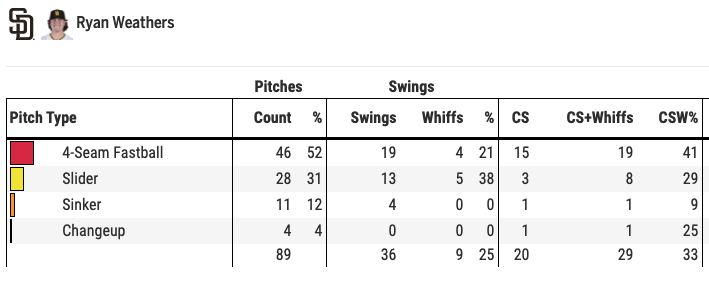 As of now, it looks like Ryan Weathers is the likely replacement after his six strikeout performance against the Dodgers. Weathers went 5.2 scoreless innings with one hit, one walk, and six punchouts. Anytime a pitcher performs well against the Dodgers, we take notice. Weathers primarily uses a four-seam and slider mix. During his start against the Dodgers, he elicited a 38% whiff rate on his slider and a 41% called strike plus whiff rate (CSW%) on his four-seamer.