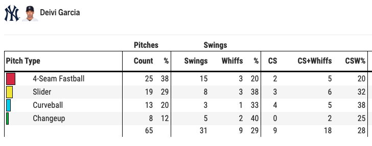 Yankees pitcher Deivi García pitched on Monday against the Orioles. García went four innings with three hits, two earned runs, three walks, and four strikeouts. He used a four-pitch mix, and his secondary pitches elicited a decent amount of whiffs and CSW%, particularly, García’s slider and curveball.
