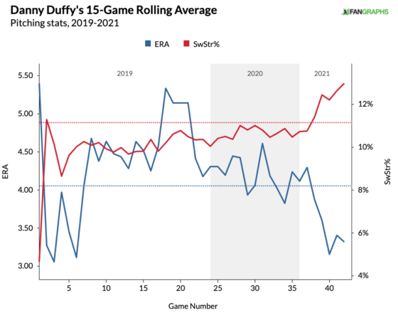 Quite unfortunate news for Danny Duffy since he pitched well to start 2021. Duffy had a 1.94 ERA, 1.13 WHIP, 28.2% strikeout rate, and 7.1% walk rate. That’s the best strikeout rate of his career, boosted by a career-high 14.2% swinging-strike rate.