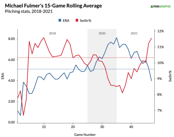 So what changed for Fulmer? Similar to other starters turned relievers, Fulmer’s velocity increased, particularly all of his pitches so far in 2021. His sinker and four-seamer velocity jumped 2 mph above 95 mph on both pitches. Meanwhile, his slider velocity also increased almost 2 mph. Unsurprisingly, the whiff rate on both fastballs went up over 20% compared to 8.5% or lower in 2020. The skills plus the potential for some saves down the line make him valuable in deeper formats.