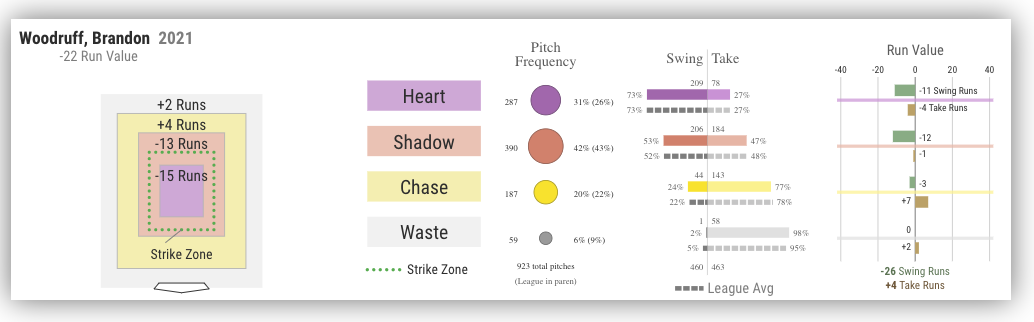- Just as a comparison, below is a look at what Brandon Woodruff's Run Value chart looks like. At -22, Woodruff has the best Net Run Value of any pitcher who has thrown more than 500 pitches. His Chase and Waste values are interestingly in the positive, but he makes up for it with a whopping -28 value combined in the Heart and Shadow zones.