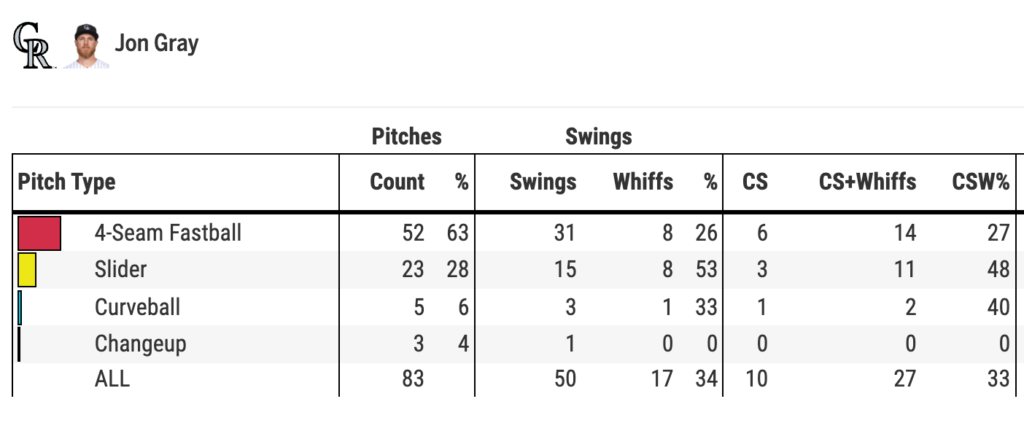 Rockies’ starting pitcher Jon Gray returned from the injured list and started on Friday against the Brewers in Milwaukee. Gray struck out ten batters in five clean innings. His slider performed well with a 53% whiff rate and 48% CSW%.