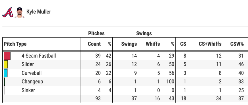 On Sunday, Kyle Muller made a start at the Reds. He tossed five scoreless innings with one hit and two walks with nine strikeouts. Both the curveball and slider performed well in terms of whiffs and CSW%. Overall, Muller finished with a 43% whiff rate and 37% CSW% on 93 pitches.