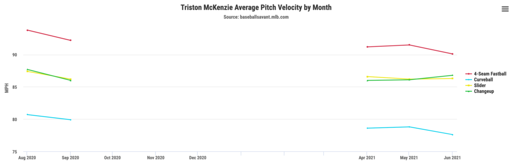 One area that looks concerning involves the dip in velocity on all of McKenzie’s pitches. Cleveland pitchers typically adjust their pitch mix to lower their fastball usage and increase their secondary pitches. However, McKenzie relies heavily on his four-seamer with a 63.3% usage in 2021, up from 53.3% in 2020. It seems that McKenzie would benefit from increasing the curveball and slider usage that both elicit a swinging-strike rate that hovers around 19% this season. If you have the room, stash McKenzie in deeper leagues.