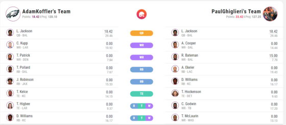 As we can see in the screenshot above, both teams had players play on Thursday night. In fact, they both had Lamar Jackson as their QB1. Paul also had Rashod Bateman play, who scored an extra three points due to recording three first downs. Paul may have to swap Chris Godwin out of his lineup but has both Chris Carson and Alex Collins on his bench.