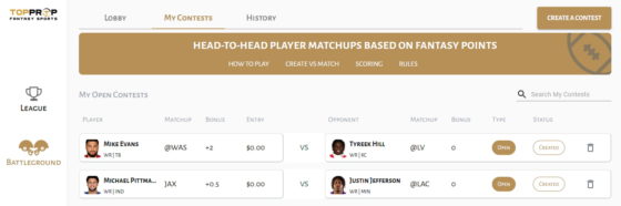 TopProp’s Battleground allows users to create head-to-head matchups based on projected fantasy points. Similar to their team challenge mode, there will be bonus points assigned to the underdog, essentially creating a margin that the favored team will have to win by. Seem simple enough? It is, and that’s the beauty. You can issue challenges to friends, league mates, rivals, or the TopProp community as a whole. The league challenges were fun, but the Battleground has a chance to revolutionize the fantasy space, and we are excited about it.